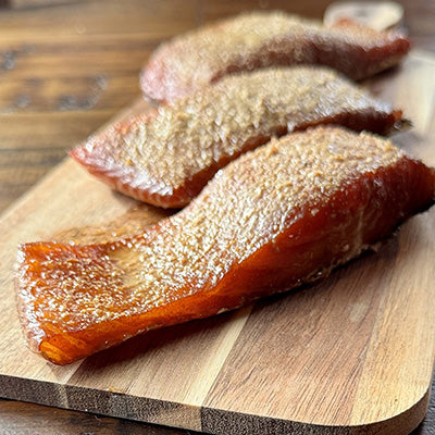 We choose freshly caught salmon because it is unbeatable in all standards. Its high oil content makes for a perfect texture and a very consistent smoke. It stays moist and retains the flavor of apple and cherry wood smoke without overpowering the natural flavor of the fish. Salmon is packed with high Omega 3 contents, as well as multiple other vitamins and minerals that make for a delicious and healthy part of our diet.